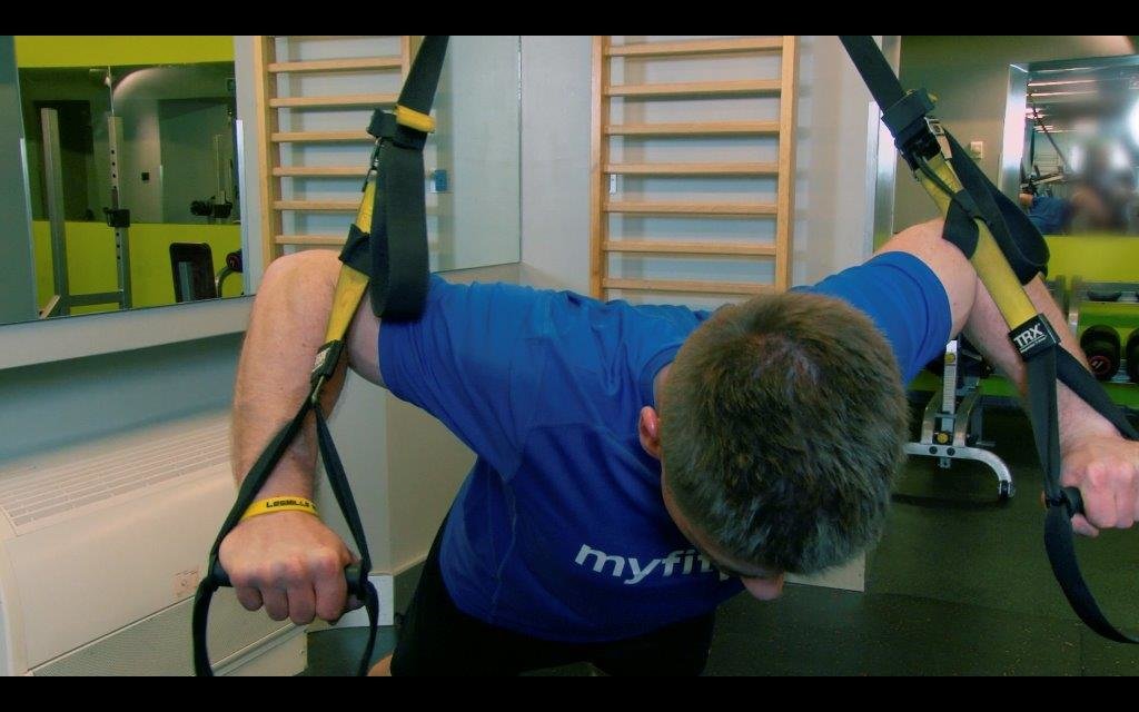 - Stajemy tyłem do miejsca zaczepienia trx, opieramy ciężar ciała na ramionach przy prostych łokciach, trzymając za uchwyty.